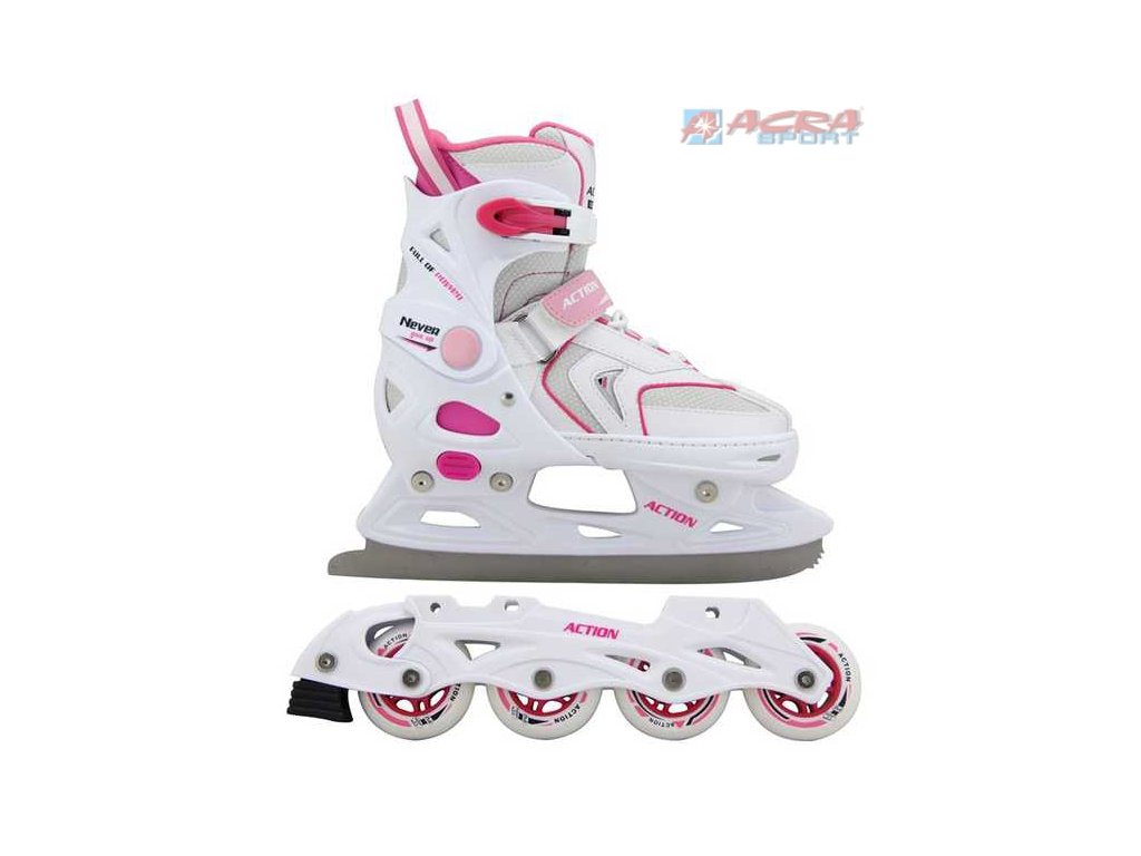 Dámské brusle s vyměnitelným podvozkem 2v1 představují univerzální řadu bruslí k celoročnímu použití.Přiložené dva podvozky umožňují univerzálně měnit kolečkové brusle se zimními pruslemi - měkká šněrovací bota s přezkou a stahovacím páskem na suchý zip, vnitřní výplň s "pamětí", ložiska ABEC - 5, zpevněný plastový podvozek, PU vrstvená kolečka 72 x 24 mm v transparentní barvě.