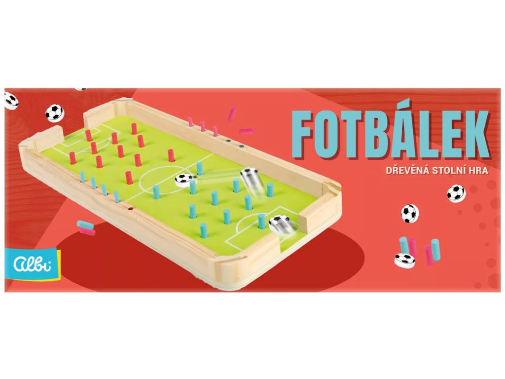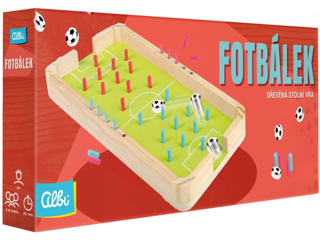 ALBI Fotbálek - dřevěná stolní společenská hra.Dřevěné stolní hry od Albi je série 3 jednoduchých zábavných her pro 2 hráče, které si nejlépe užijete na rodinném či přátelském posezení. Fotbálek přináší zábavu v podobě cvrnkání, kterým si hráči mohou procvičit taktiku a přesnost. Přebíjená zase vyžaduje rychlé reakce k přesunu žetonů na soupeřovu stranu, zatímco v Katapultu se hráči snaží vystřelit žetony do cílového pole.