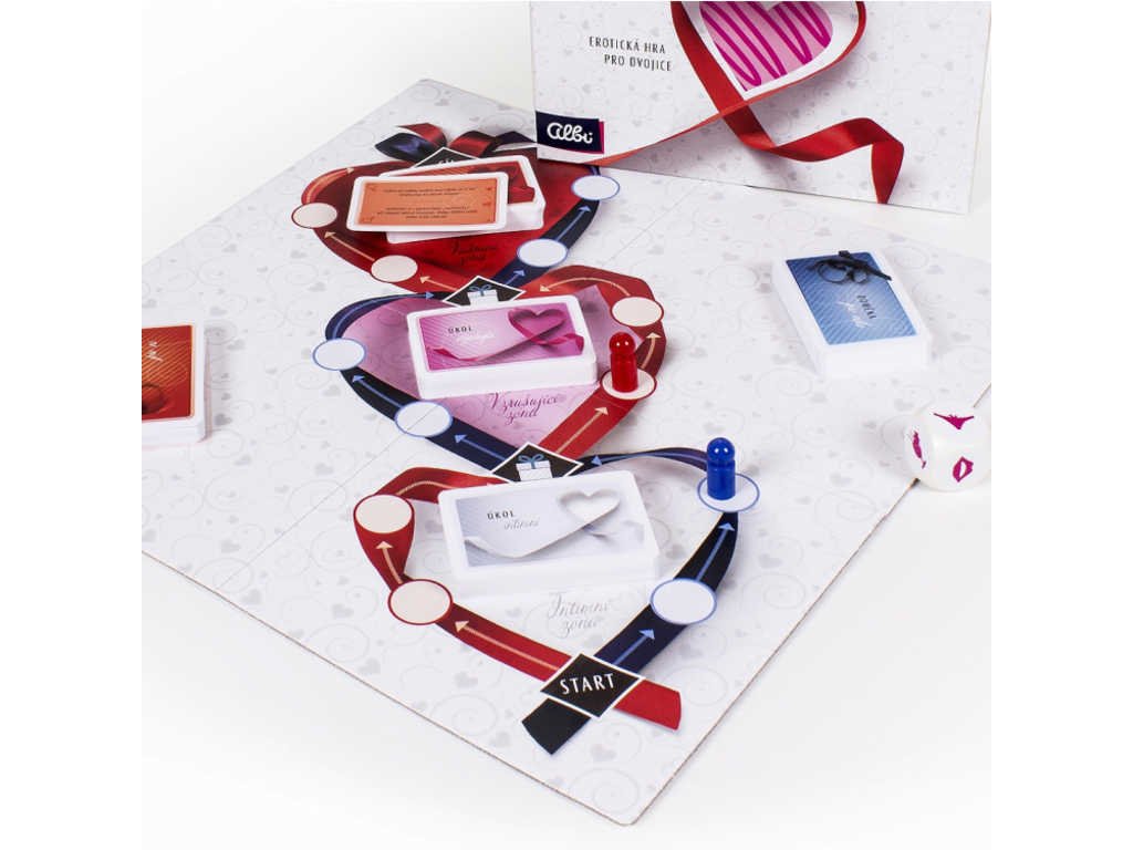 Obsah balení: 150 karet úkolů, 100 karet odměn, figurka pro ni, figurka pro něho, velká hrací kostka, herní plán, pravidla