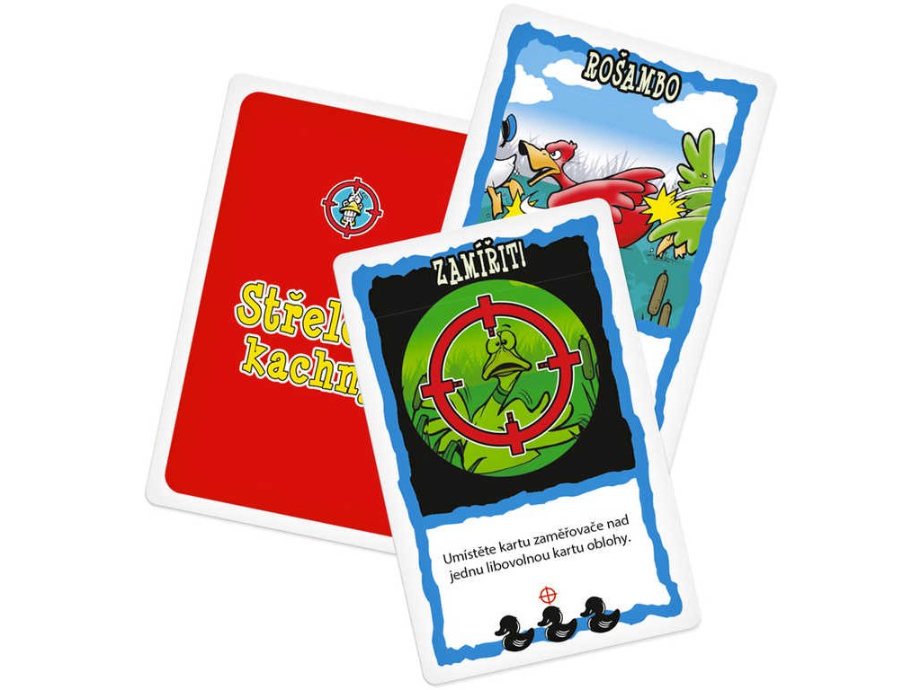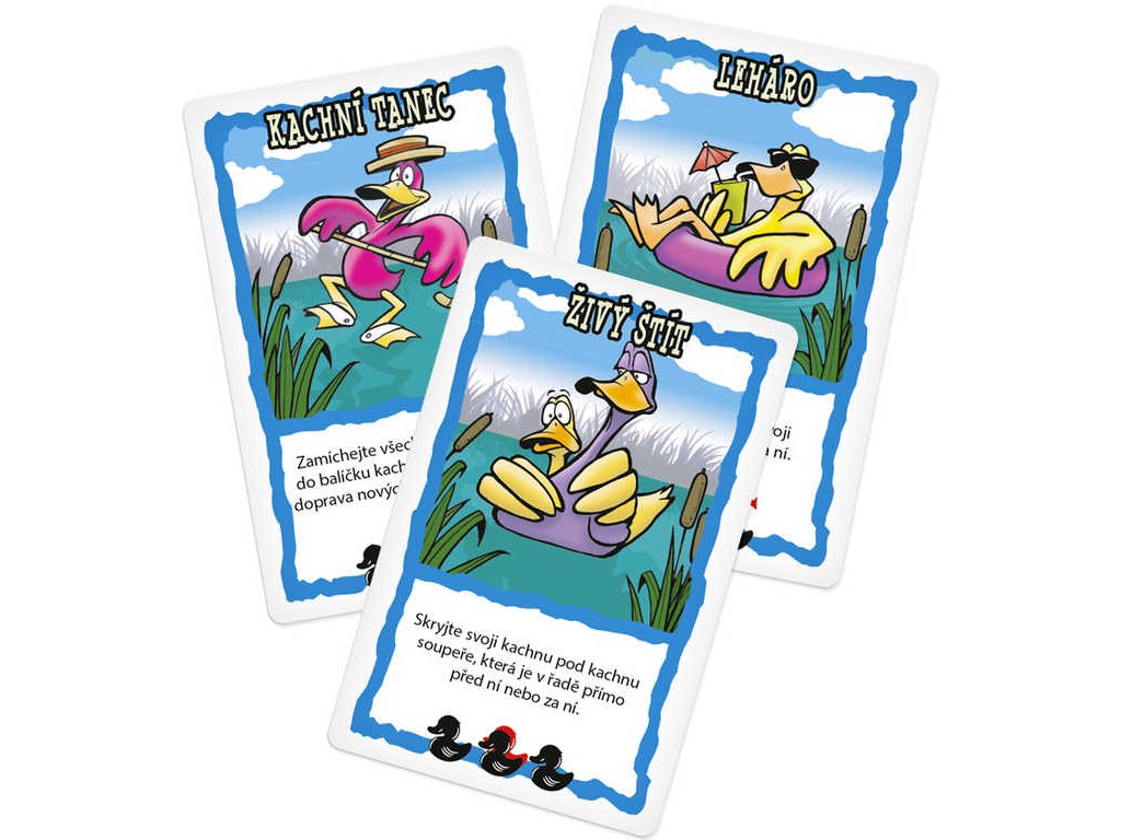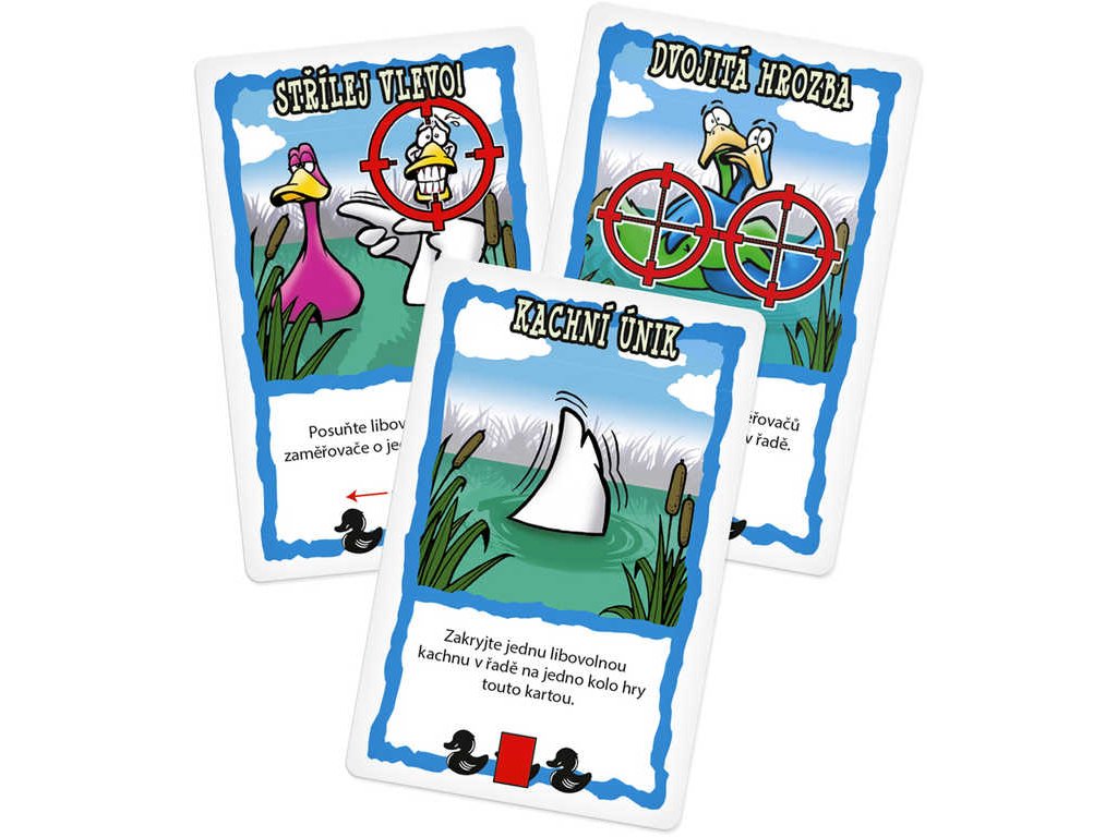 Obsah balení: 36 karet kachen, 5 karet vody, 52 akčních karet, 6 karet oblohy, 6 karet zaměřovačů, česká a slovenská pravidla