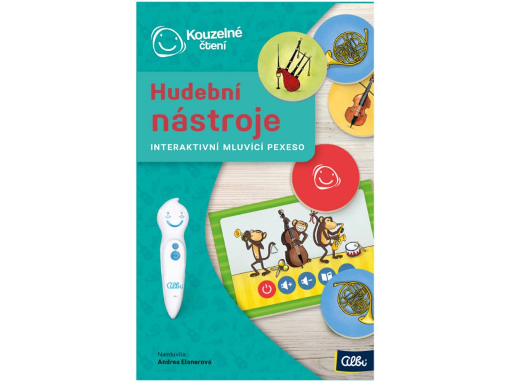 Hudební nástroje - Interaktivní mluvicí pexeso z produktové řady "Kouzelné čtení" od Albi.Populární Kouzelné čtení se rozrostlo o mluvící pexesa. Pexeso je známá a oblíbená hra. Ovšem díky zvukům získává zcela nový rozměr. Kouzelné mluvící pexeso Hudební nástroje kombinuje vizuální a poslechovou paměť dětí. Děti se tak budou učit rozeznávat zvuky, která nás obklopují. Pexeso nabízí více herních variant. Lze jej hrát jako klasické pexeso, kdy jsou všechny karty otočeny obrázky dolů a děti poznávají karty podle zvuku. Snadnější variantou je, že se otočí pouze půlka kartiček a děti hledají druhou kartičku podle zvuku. Pexeso lze hrát i jako obyčejné pexeso bez zvuků.