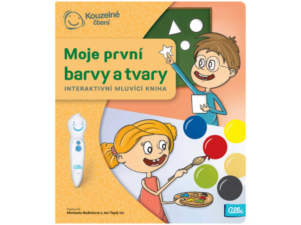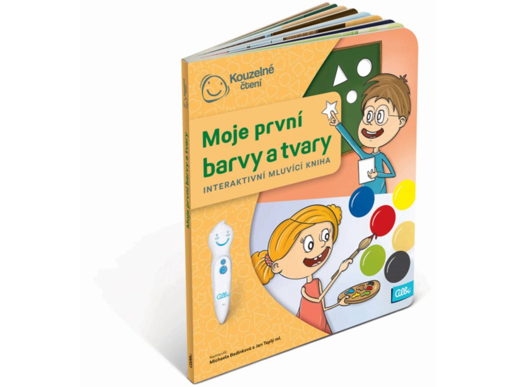 Moje první barvy a tvary - Interaktivní mluvicí kniha z produktové řady "Kouzelné čtení" od Albi.Interaktivní mluvící kniha Moje první barvy a tvary z edice Kouzelné čtení provede děti od 3 let světem kolem nás a ukáže jim, jak již název napovídá, všemožné barvy a tvary. Průvodci se stanou sourozenci Sára a Tom a poví dětem například jaká barva vznikne smícháním červené a modré, jaký tvar má včelí plástev a co je silueta. Kniha je plná dialogů a zvuků, které děti zaujmou. Nechybí ani oblíbené zábavné kvízy ve 3 úrovních obtížnosti. Kniha Moje první barvy a tvary obsahuje přes 2100 zvuků a textů. Je namluvena Michaelou Badinkovou a Janem Teplým ml.