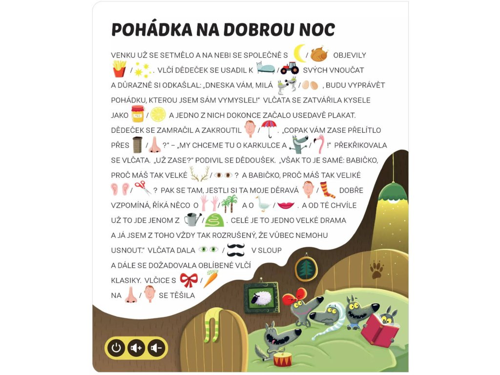 Slunce už zapadlo, ale všechna vlčata jsou stále vzhůru. Vlčí dědeček se tak musí pustit do vyprávění pohádek na dobrou noc. V knize Obrázkové čtení: Pohádky vlčího dědečka najdete 8 příběhů o strašidlech. Součástí textů jsou obrázky, které dětem od 5 let umožňují vydat se při čtení klasickou nebo legrační cestou. Kniha také ukrývá oblíbené interaktivní kvízy a plno zajímavostí o našich smyslech! Kniha obsahuje přes 1 800 zvuků a textů.