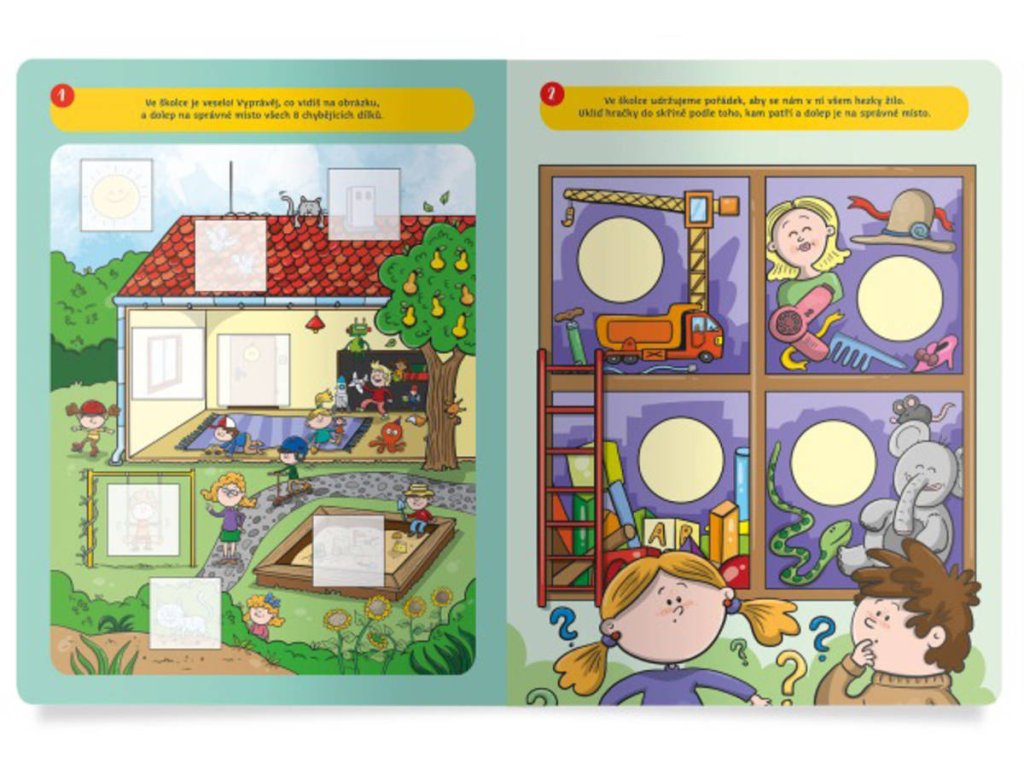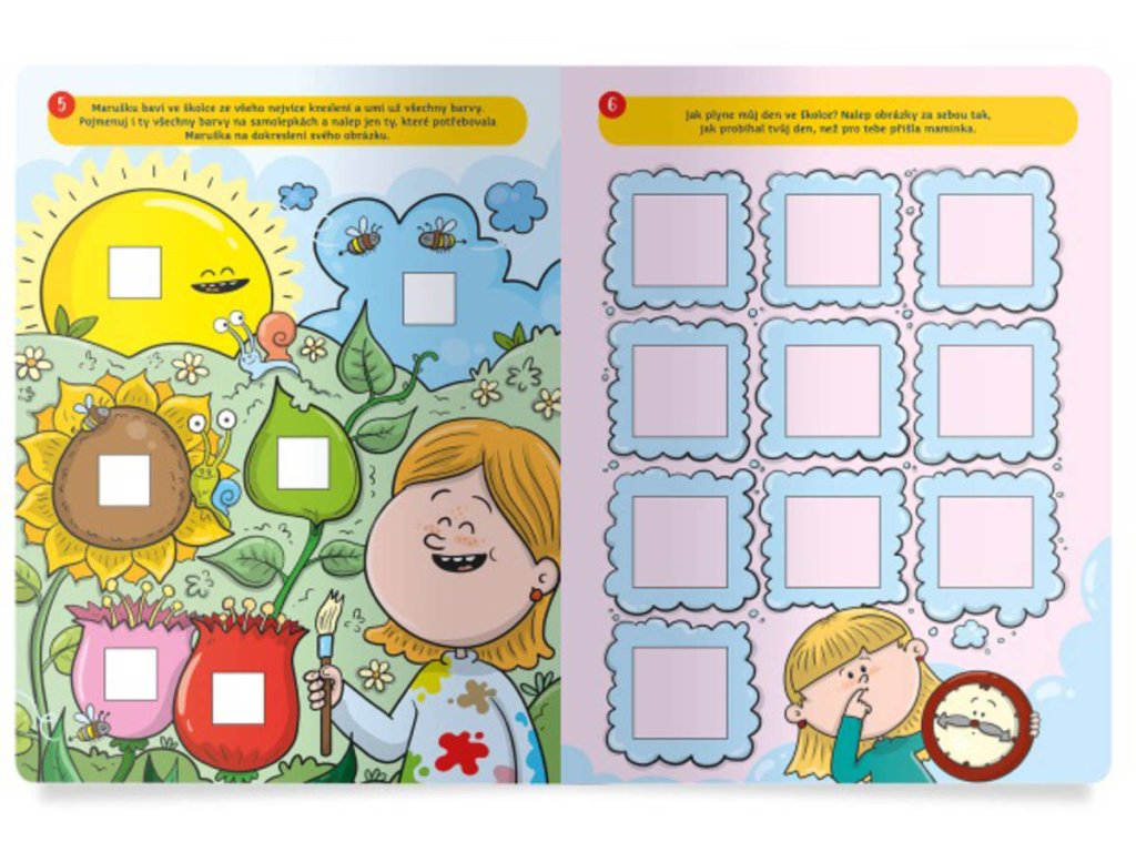 Samolepkové aktivity od Kvída - Těším se do školky - Sešit s 22 obrázkovými úkoly a aktivitami se 134 většími samolepkami na doplňování úkolů a 19 obrázky k vystřihování.Samolepkové aktivity jsou sešity pro děti, které obsahují úkoly s aktivitami na doplňování. Samolepkové aktivity rozvíjí jemnou motoriku, zrakové vnímání, koncentraci a logické uvažování.