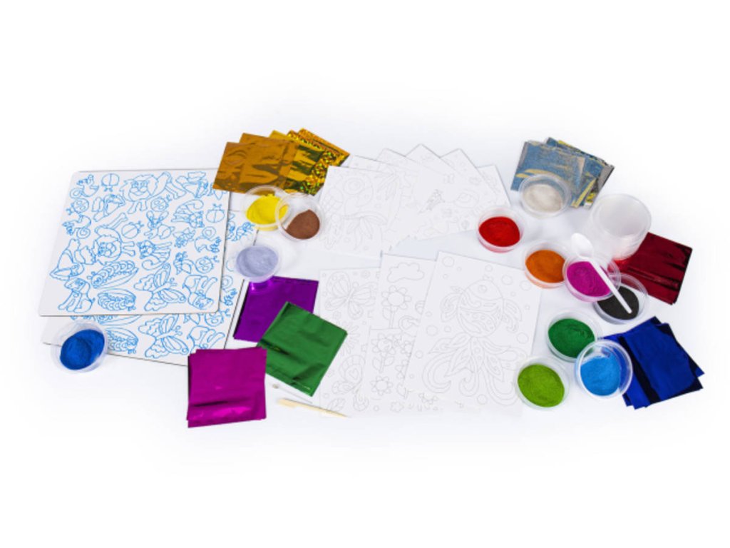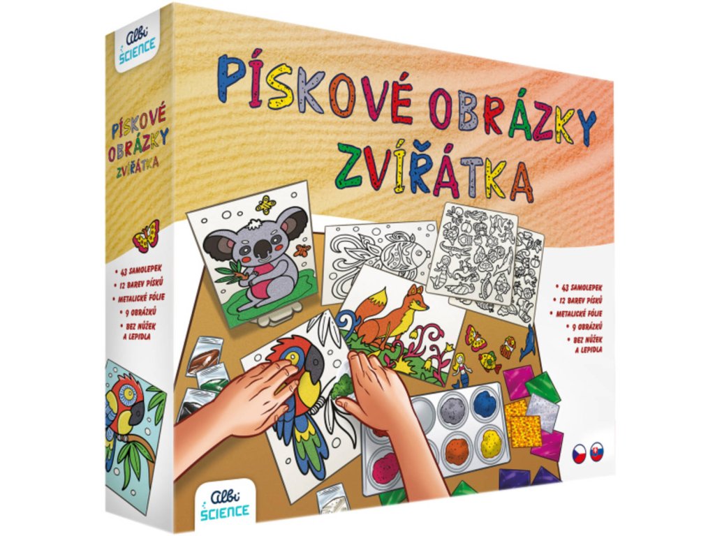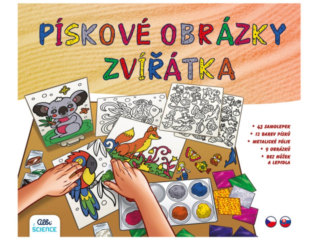 Pískové obrázky se zvířátky od Albi.Nakombinuj dvě techniky – pískování a malování metalickými fóliemi – a vytvoř mnoho různých barevných variant obrázků a samolepek zvířátek. Tvoření je snadné a zábavné pro malé i starší děti. Poznej historii pískování, vyrob si 9 obrázků a mnoho samolepek. Práce s barvami i technikami bez použití nůžek a lepidla.