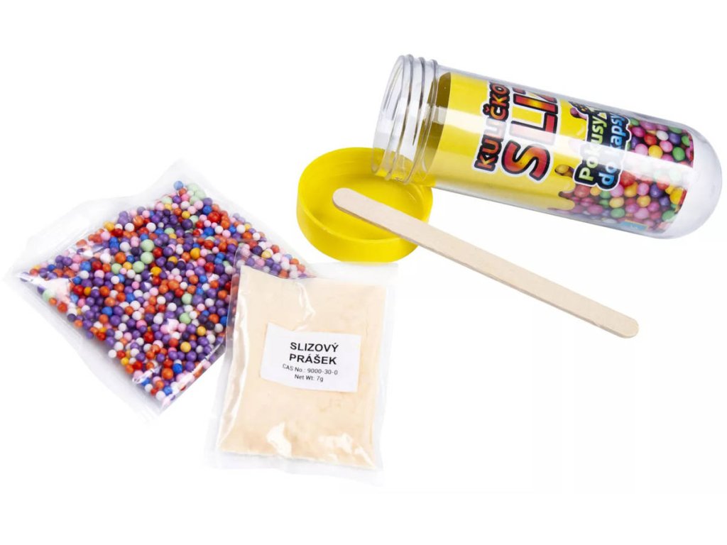 Obsah balení: prášek na sliz, míchací tyčinka, pestrobarevné polystyrénové kuličky