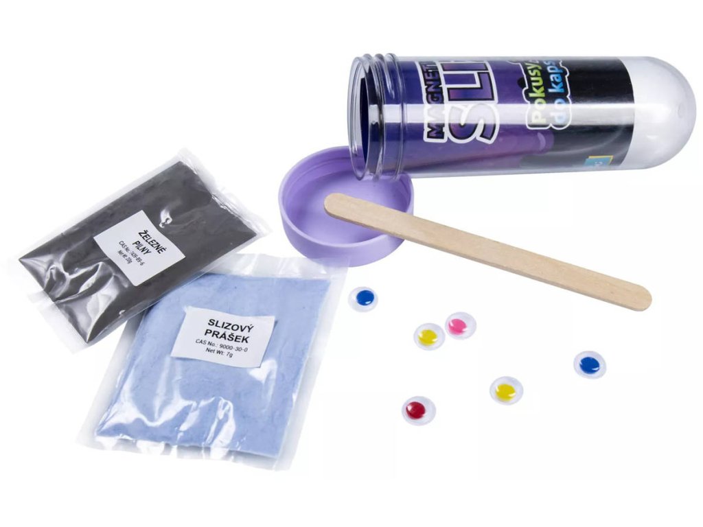Obsah balení: modrý prášek na sliz, míchací tyčinka, kovové piliny, nalepovací oči