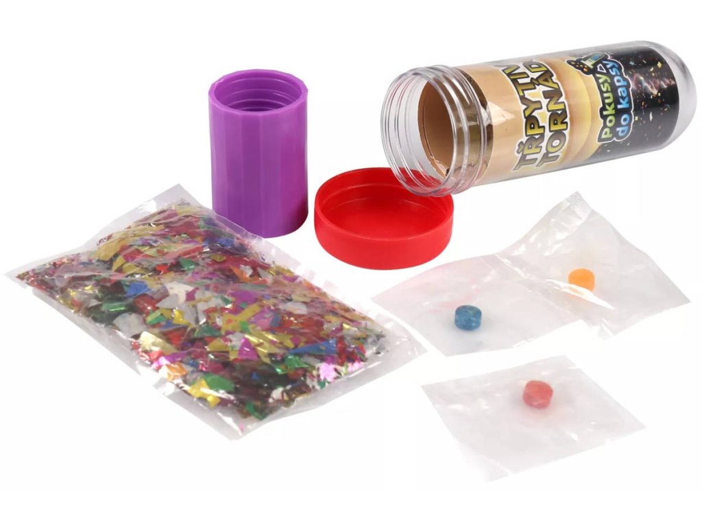 Obsah balení: 2 tablety měnící barvu, trubička na spojení PET lahví, pinzeta, kousky barevné třpytivé fólie