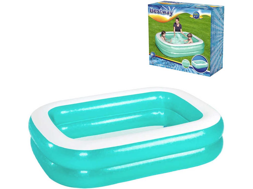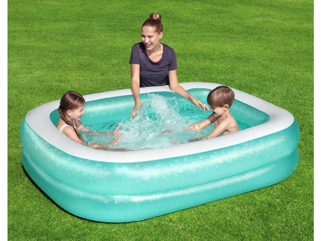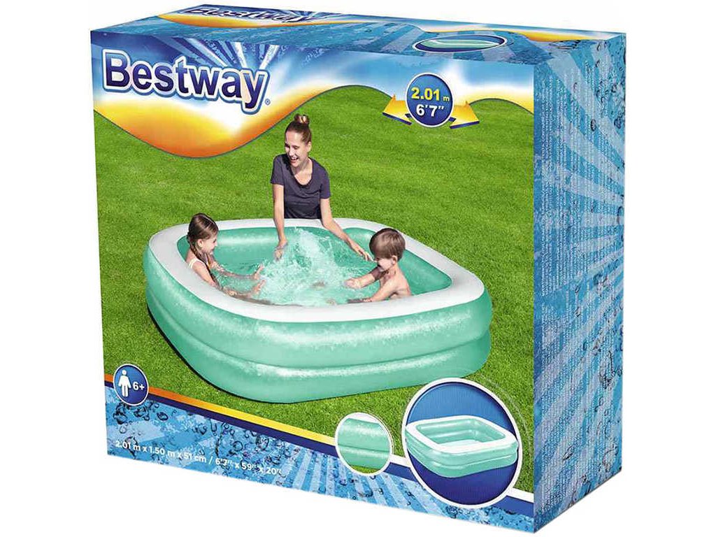 54005 Bestway nafukovací bazén FAMILY 2-komorový modrozelený s grafikou.Nafukovací bazén Family dvoukomorový, 201 x 150 x 51 cm, průhledné stěny, kapacita vody (75%) 455 L.