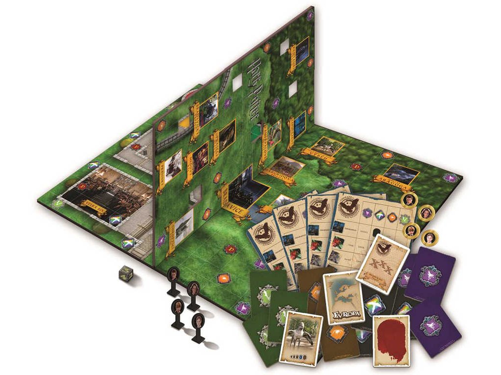 Obsah balení: otočná hrací deska s dvěma hracími plochami, 4 figurky, arch samolepek, 72 karet se stopami, 4 tabulky Ministerstva kouzel, kostka, pravidla