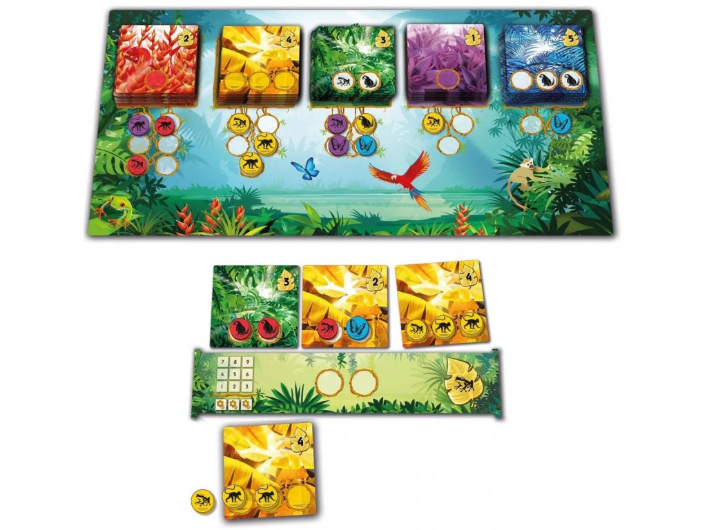 Obsah balení: hlavní herní deska, 112 dřevěných žetonů zvířat, 4 desky hráčů, látkový sáček, 55 destiček džungle, 10 žetonů chráněné oblasti, žeton dalekohledu, 4 žetony rozmanitosti