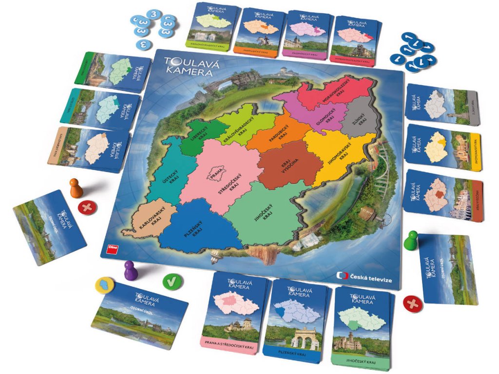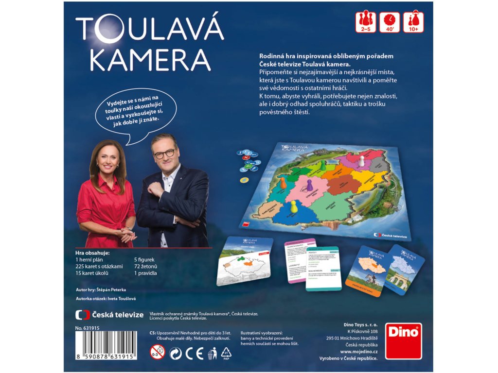 Toulavá kamera - Napínavá vědomostní společenská hra na motivy populárního pořadu České televize pro 2 až 5 hráčů od 10 let.Rodinná hra inspirovaná oblíbeným pořadem České televize Toulavá kamera. Připomeňte si nejzajímavější a nejkrásnější místa, která jste s Toulavou kamerou navštívili a poměřte své vědomosti s ostatními hráči. K tomu, abyste vyhráli, potřebujete nejen znalosti, ale i dobrý odhad spoluhráčů, taktiku a trošku pověstného štěstí.