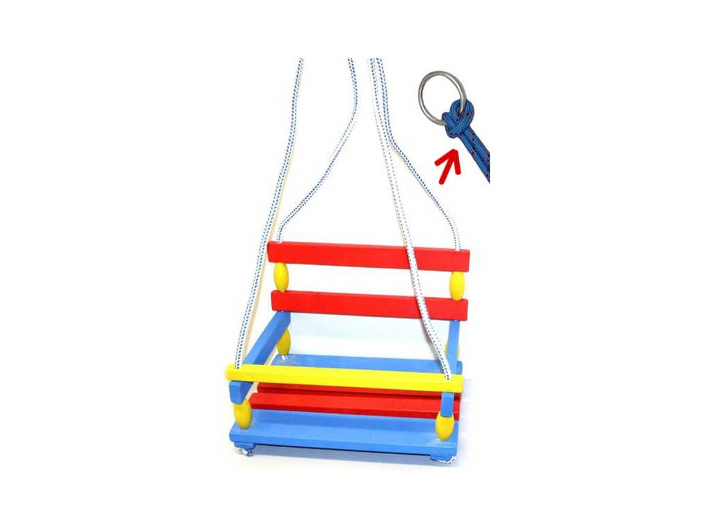 Klasická houpačka k zavěšení ze dřeva pro děti s ohrádkou (zábranou) a opěrátkem, v sáčku.Houpačka je vyrobena z přírodního dřeva a opatřena přední ohrádkou. Tudíž je stabilní a bezpečná. Barevná kombinace červená, modrá a žlutá. Vhodná k venkovnímu i domácímu použití.