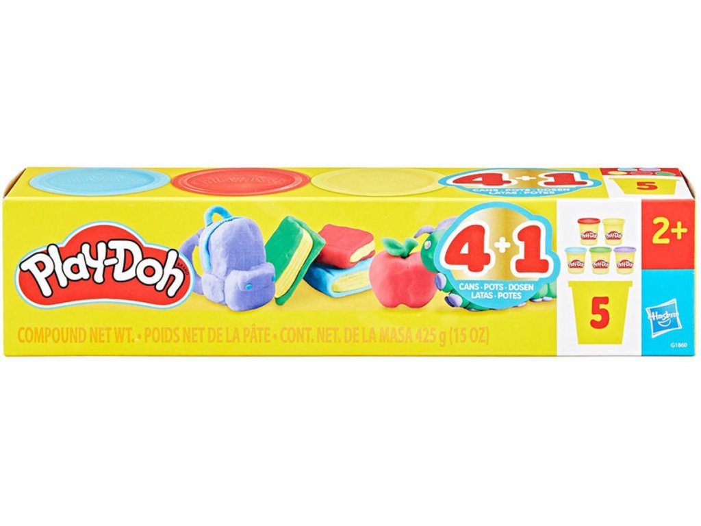 HASBRO PLAY-DOH Modelína Back to school. Součástí 5 kelímků s modelínou v různých barvách, 5x 85g. 4 + 1 kelímek zdarma.Sada Play-Doh „Zpátky do školy“ s 5 barevnými modelínami je mnohem víc než jen hračka! Je to skvělá sada pro různé kreativní aktivity pro děti od 2 let. Děti mohou využít svou představivost a smysly díky 5 různým barvám, z nichž každá váží 85 gramů. Ať už jsou připraveny začít chodit do školy, nebo ještě doma objevují svět, tato sada je ideální jako dárek nebo jako doplněk k dalším hračkám Play-Doh.
