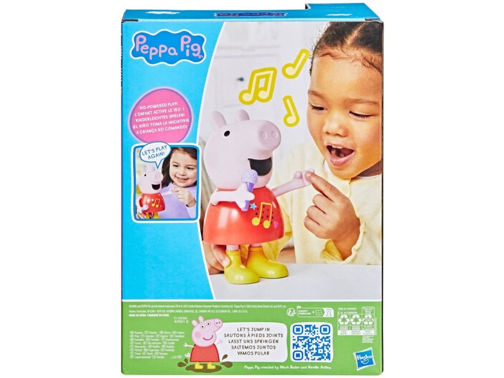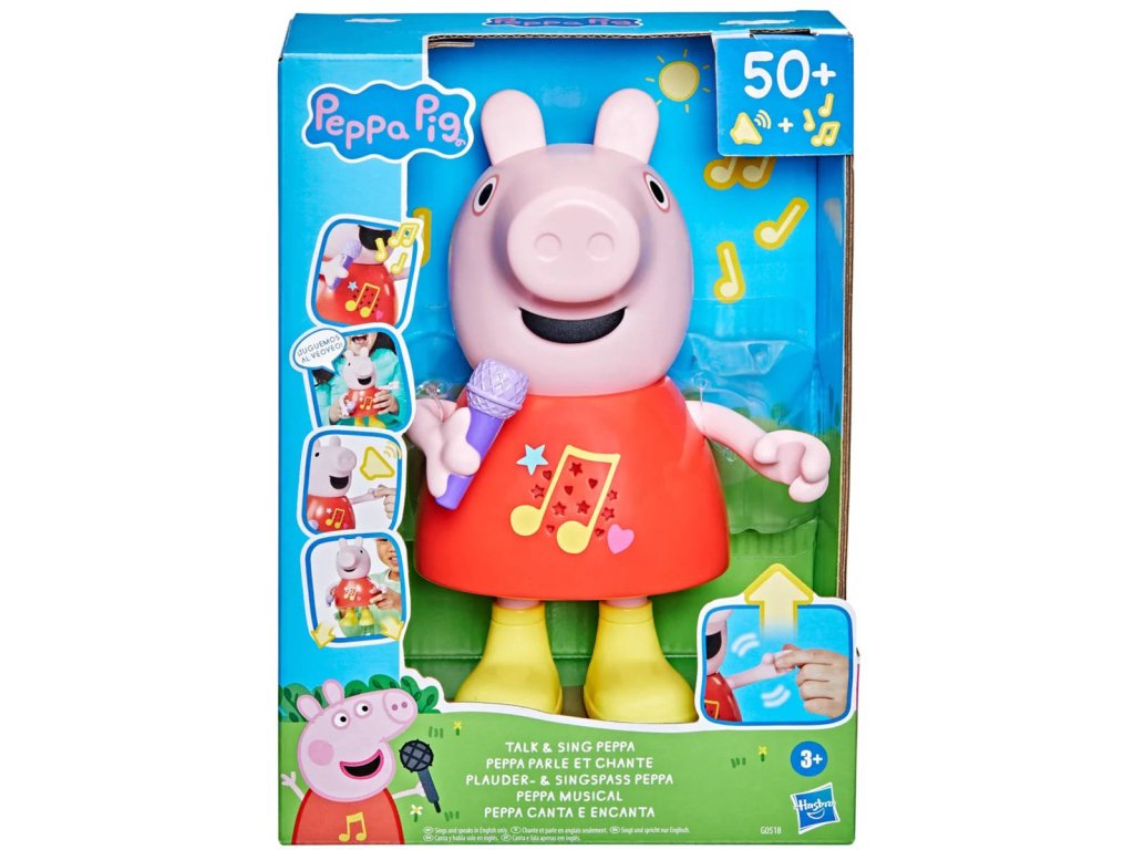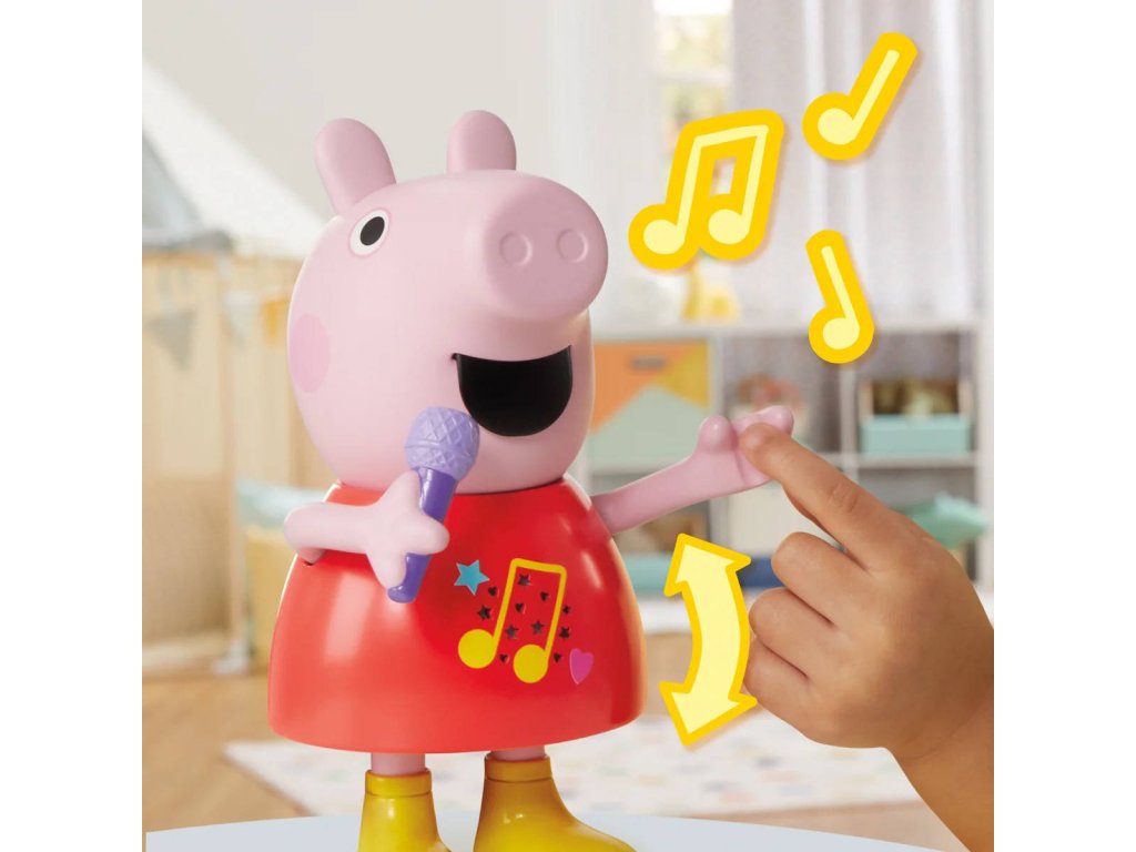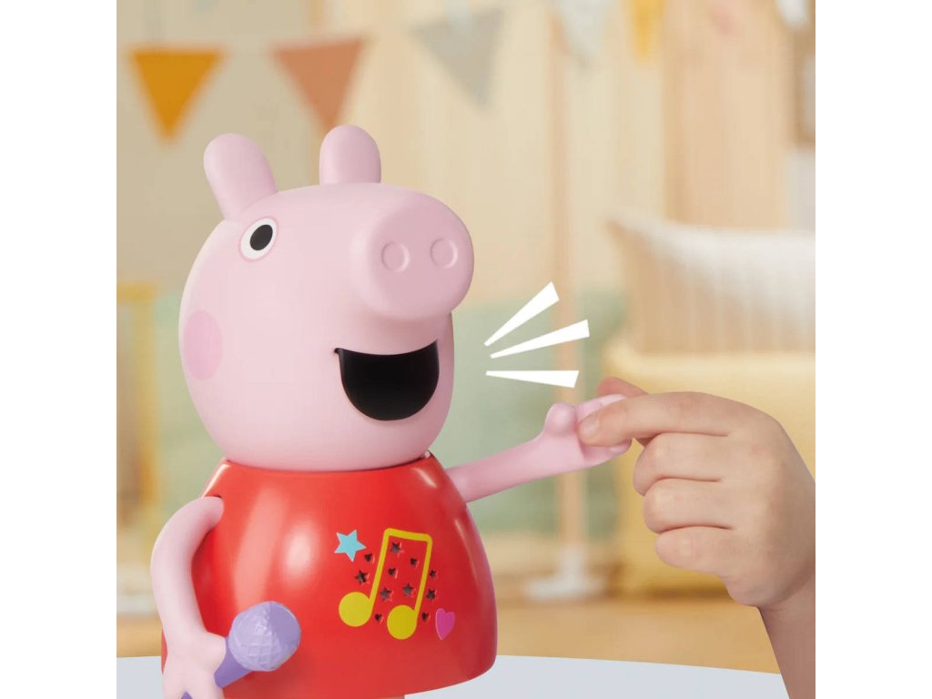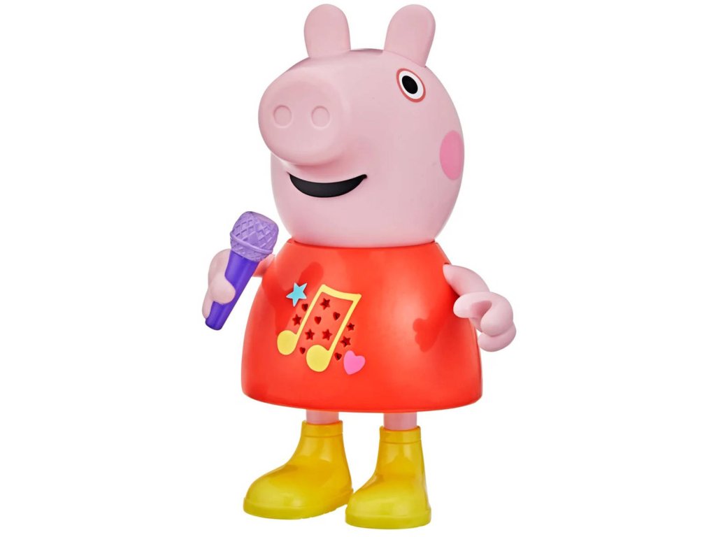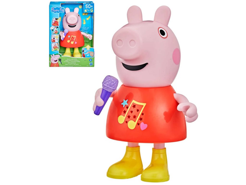 Plastová postavička prasátko Peppina na baterie, se zvukem. Umí zpívat, mluvit, hraje, pohybuje mikrofonem, zvukové efekty, velikost 20cmMluvící a zpívající prasátko Peppa Pig. Díky více než 50 frázím, písním a zvukovým efektům bude hra s mluvícím a zpívajícím prasátkem Peppa tak zábavná. Tato super roztomilá hračka pro dívky a chlapce mluví, hraje a zpívá čtyři písničky, výměna režimů je stejně snadná jako pohyb jejího mikrofonu nahoru nebo dolů. Děti mohou pohybovat její paží, aby se její ústa pohybovala a slyšely ji mluvit nebo zpívat. Malé prasátko dokáže předstírat, že skáče do blátivých louží, aby předvedlo šplouchající zvukové efekty. Prasátko mluví a zpívá pouze v angličtině.