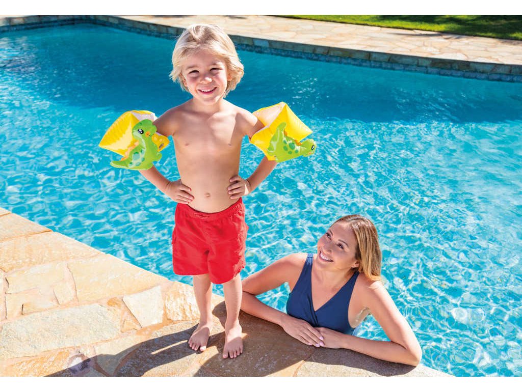INTEX 56664Tyto žluto-zelené plovací nafukovací rukávky s dinosaury mají dvě vzduchové komory. Rukávky na plavání pro děti jsou vyrobeny z kvalitního vinylu. 1 pár rukávků v balení.