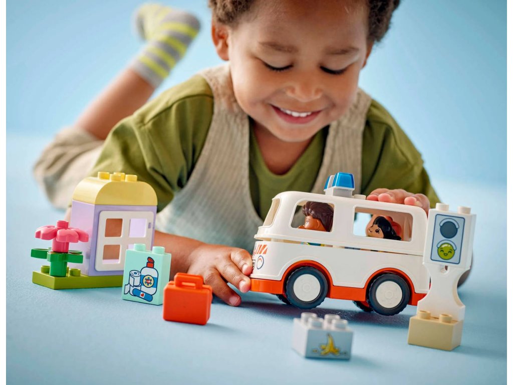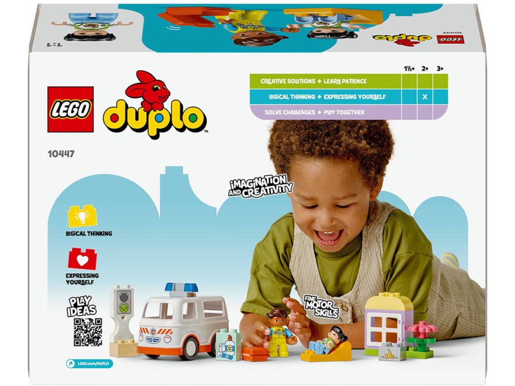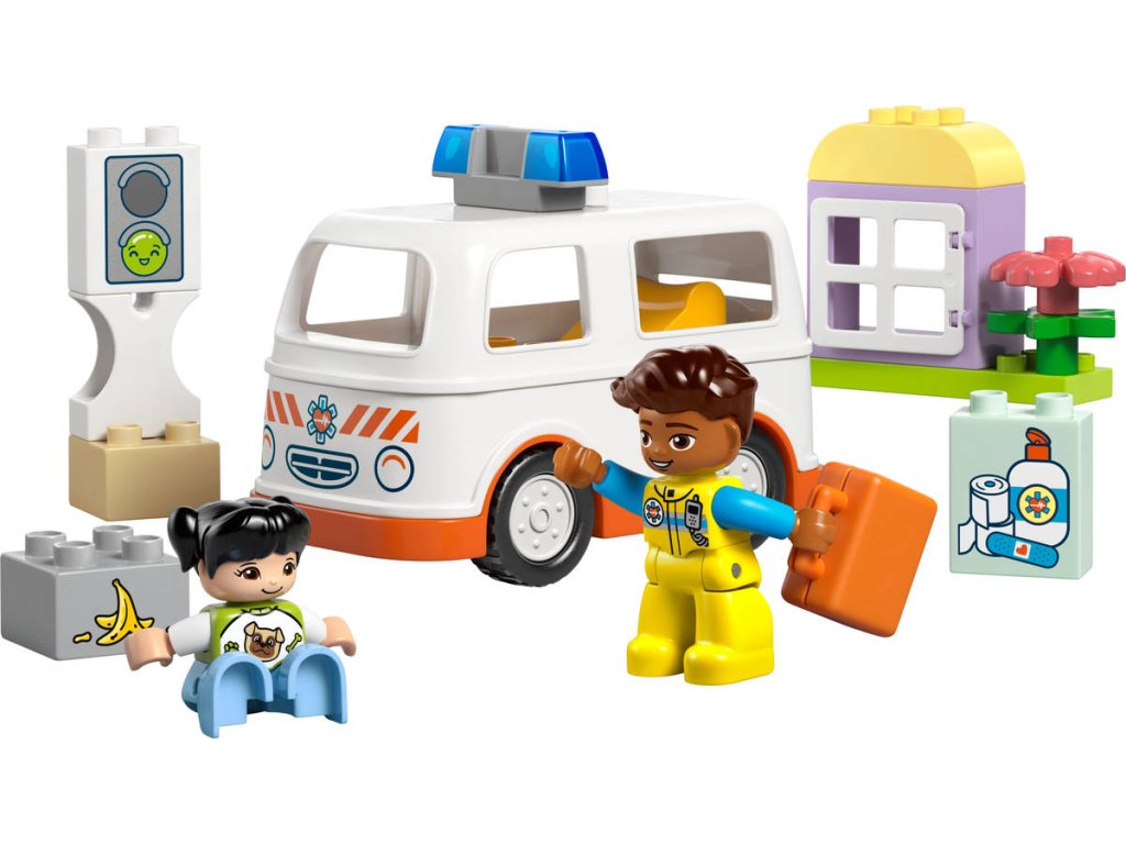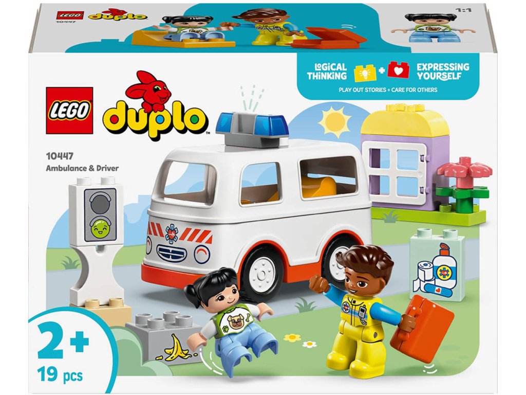 LEGO 10447 - Auto sanitka a řidič z produktové řady LEGO DUPLO - Dětská plastová stavebnice v krabici.Starostlivé děti si užijí hraní napínavých záchranářských scén se stavebnicí Sanitka a řidič. Součástí je pojízdná sanitka a 2 figurky LEGO DUPLO, záchranář a dívka, se kterými si děti užijí kreativní hru na postavy. Tato kreativní hračka LEGO DUPLO představuje skvělý dárek pro malé děti, které mají rády hry na rozvoj sociálních a emočních dovedností, a pomůže jim prohlubovat empatii. Součástí návodu na stavění je tištěné herní kolečko, se kterým rodiče a děti prozkoumají různé emoce postavičky holčičky. Děti s jeho pomocí vyjádří své pocity při tom, když se někdo necítí dobře, nebo jak se cítily, když poprvé viděly sanitku. Stavebnice také pomáhá rozvíjet logické myšlení při sestavování sledu událostí a jemné motorické dovednosti při otevírání střechy sanitky, přes kterou umístí figurku na sklápěcí lůžko. Tato vzdělávací hračka také pomáhá malým dětem rozvíjet sociální dovednosti při rozhodování, jak bude řidič sanitky zacházet s pacientkou.