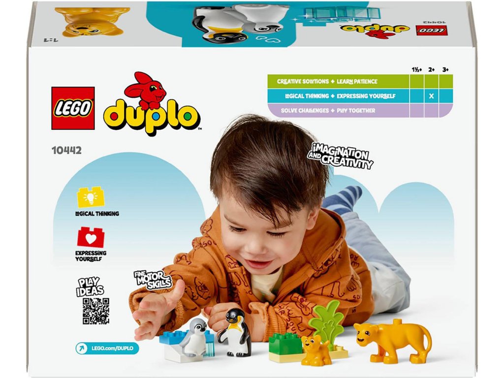 LEGO 10442 - Rodinky divokých zvířat: Tučňáci a lvi z produktové řady LEGO DUPLO - Dětská plastová stavebnice v krabici.Vydejte se s dětmi od 2 let na zábavnou vzdělávací cestu z Antarktidy do Afriky s touto roztomilou stavebnicí s přírodní tematikou. Stavebnice Rodinky divokých zvířat: Tučňáci a lvi obsahuje 2 tučňáky a 2 lvy LEGO DUPLO, kteří děti inspirují k hodinám zábavného kreativního hraní. Představte dětem rozdíly mezi dospělými zvířátky a jejich mláďaty a ukažte jim tropické a chladné podnebí. Pomozte své ratolesti rozvíjet pečovatelské dovednosti při hře na dospělá zvířátka, která se starajío svá mláďata. Ukažte jim, že stejně jako vy si i zvířecí rodiče rádi hrají se svými potomky. Společně postavte ledovou skluzavku pro tučňáky a travnatou plochu, na které si mohou hrát lvi. Při hraní a stavění bude vaše dítko rozvíjet své jemné motorické dovednosti.