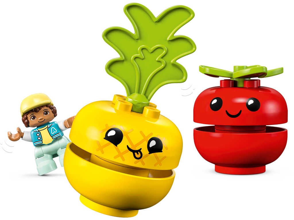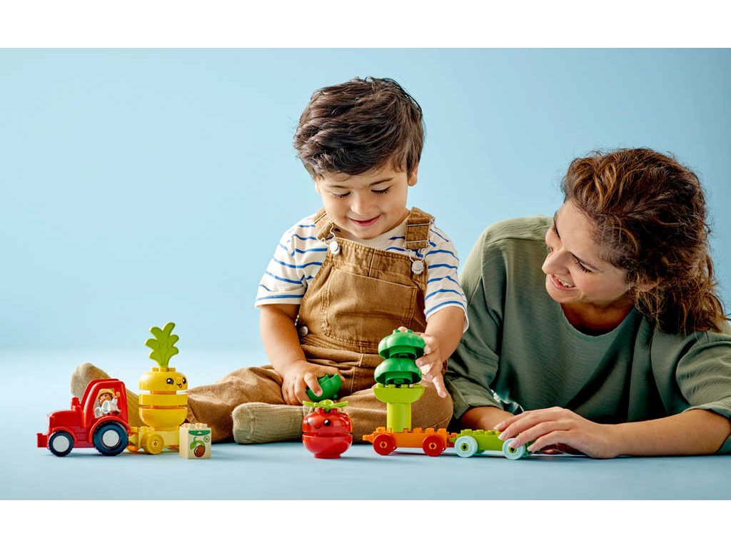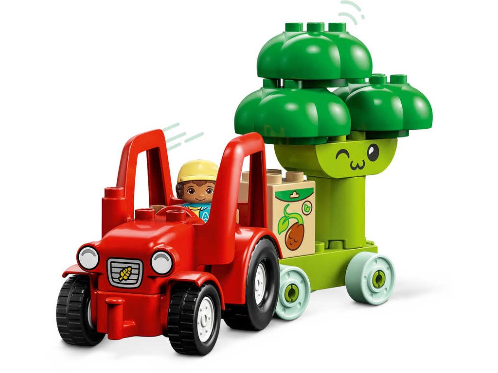 LEGO 10982 - Traktor se zeleninou a ovocem z produktové řady LEGO DUPLO. Dětské plastové kostky v krabici.Stavebnice Můj první traktor se zeleninou a ovocem přináší těm nejmenším spoustu způsobů, jak se učit. Děti budou pomáhat farmáři sklízet plodiny s traktorem se 3 přívěsy. Děti od 18 měsíců zdokonalí své motorické dovednosti a zjistí, jak se pěstuje zelenina a ovoce. Při skládáním kostek na sebe si mohou hrát na to, že plodiny „rostou“. Také si užijí zábavu při třídění podle barev, protože budou dávat rostliny do správných přívěsů. Malé děti však mohou zapojit i svou kreativitu a schopnost sebevyjádření, aby pomíchaly barvy podle sebe nebo změnily obličeje, jak se jim zlíbí! Všechny hračky LEGO DUPLO jsou odborně navržené tak, aby přinášely zábavné příběhy, pestré barvy, zajímavé postavy a spoustu detailů, které podnítí rozvoj dovedností malých stavitelů. Tento model je kompatibilní s dalšími stavebnicemi z řady Moje první na motivy farmaření a se všemi modely LEGO DUPLO.