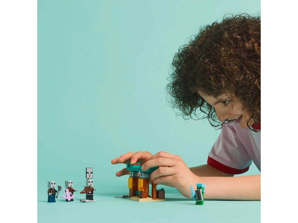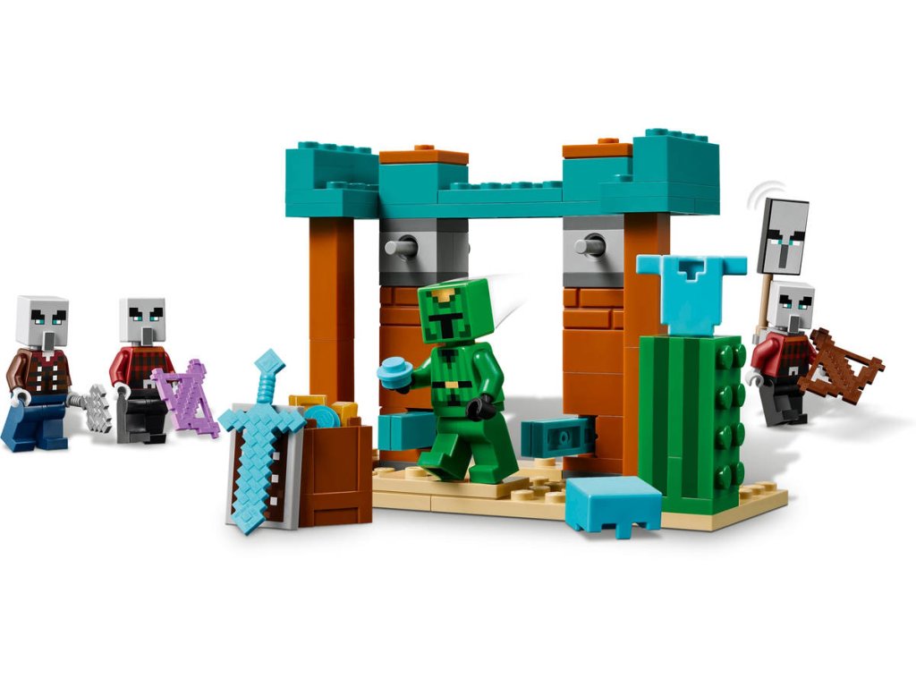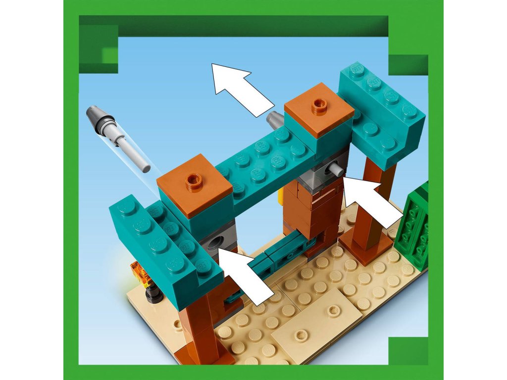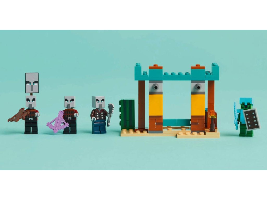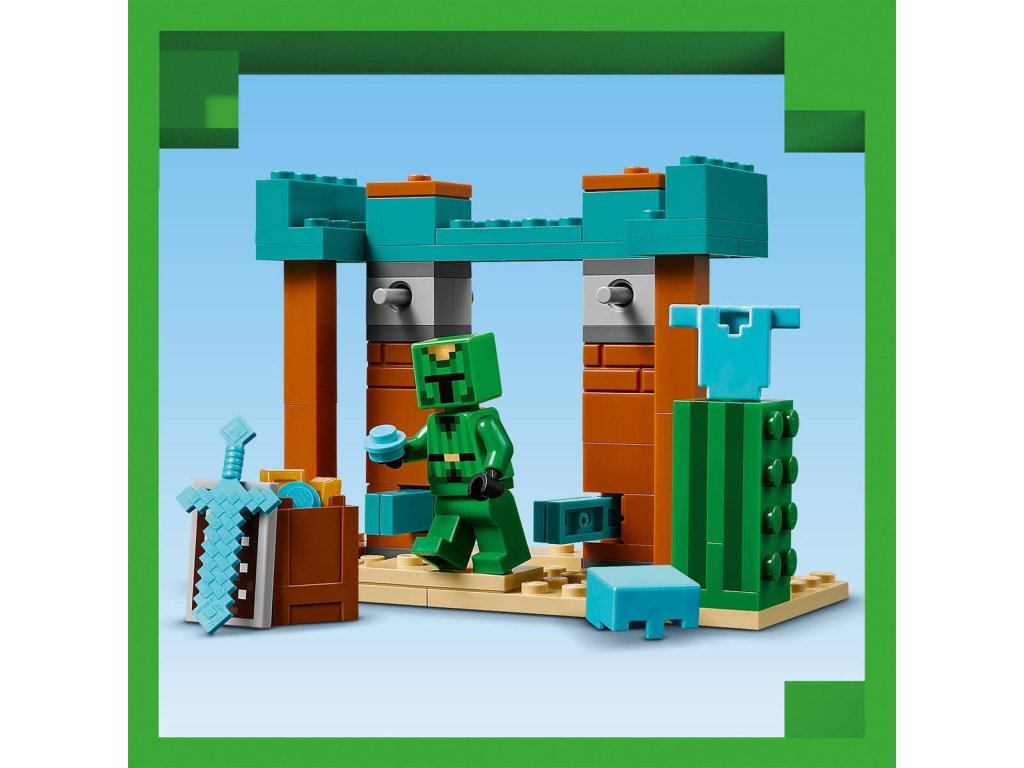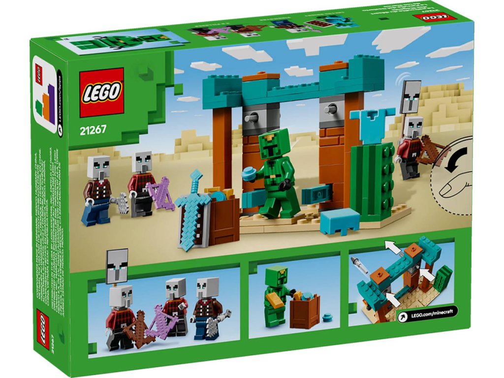 LEGO 21267 - Pouštní hlídka zákeřníků z produktové řady LEGO MINECRAFT - Dětská plastová stavebnice v krabici.Hráči hry Minecraft si užijí hodiny zábavy s touto malou stavebnicí LEGO pro děti od 7 let. Pouštní hlídka zákeřníků se 4 figurkami LEGO Minecraft, zábavnými funkcemi a autentickými doplňky je miniaturní hračka s mega akcí ve stylu Minecraftu. Děti se ocitnou na pouštní základně z Minecraftu a vžijí se do role kaktusového rytíře s diamantovým brněním, štítem a mečem. Když dorazí 3 figurky zákeřníků, které chtějí ukrást poklad, děti musí základnu bránit. Součástí stavebnice jsou rakety, které děti odpálí pohybem prstu, řada zbraní a sud, ve kterém se ukrývá poklad. Pro ještě větší digitální zábavu umožňuje aplikace LEGO Builder dětem přibližovat a otáčet modely ve 3D pomocí jejich zařízení.
