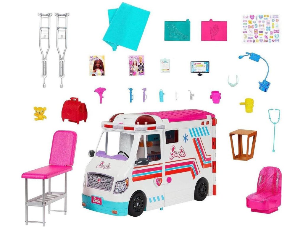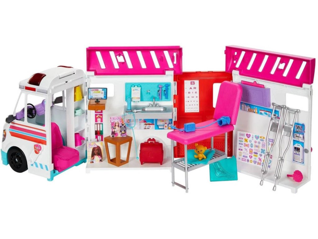 Rozložitelné auto ambulance v licenci Barbie. Velikost herního setu po rozložení 60cm. Součástí lékařské doplňky. 2in1. Sanitka / klinika.Sanitka, kterou můžeš rázem rozložit na pojízdnou ambulanci, která má po rozložení délku až 60 cm. V sanitce se nachází veškeré zdravotnické vybavení, které by doktorka Barbie mohla potřebovat na výjezdech za pacienty - berle, deku, stetoskop, injekci, lékárničku, roušku a mnoho dalších doplňků. Z přibalených nálepek si můžeš ozdobit sanitku nebo rozdávat barevné leukoplasty. Po stisku tlačítka na střeše se ozvou sirény a rozsvítí majáky, takže se k pacientovi dostaneš rychleji.
