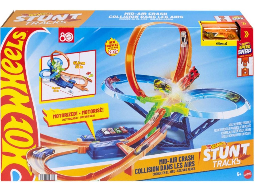 MATTEL HOT WHEELS Stunt Tracks - Srážka ve vzduchu. Součástí akční sestavitelná dráha + autíčko.Sada pro kaskadérské kousky Hot Wheels Action Mid-Air Multi-Crash přináší vzrušení z vysoké rychlosti na nepředvídatelné víceúrovňové trati. Motorizovaný posilovač pohání auta ostrými zatáčkami, odvážnými smyčkami a kolizní zónou a vyzývá děti, aby zvládly své načasování a kaskadérské dovednosti. Tato sada, navržená pro nekonečnou zábavu, povzbuzuje k vzrušujícím závodům a dramatickým vzdušným haváriím. Obsahuje jedno auto HotWheels, takže se děti mohou rovnou vrhnout do akce a zjistit, kdo přežije ultimátní výzvu. Snadná montáž a kompatibilita této sady s dalšími tratěmi Hot Wheels umožňují nápady na vlastní závody a nápaditá rozšíření. Děti se mohou neomezeně bavit vysokou rychlostí, ať už se učí triky nebo vytvářejí vzrušující havárie.