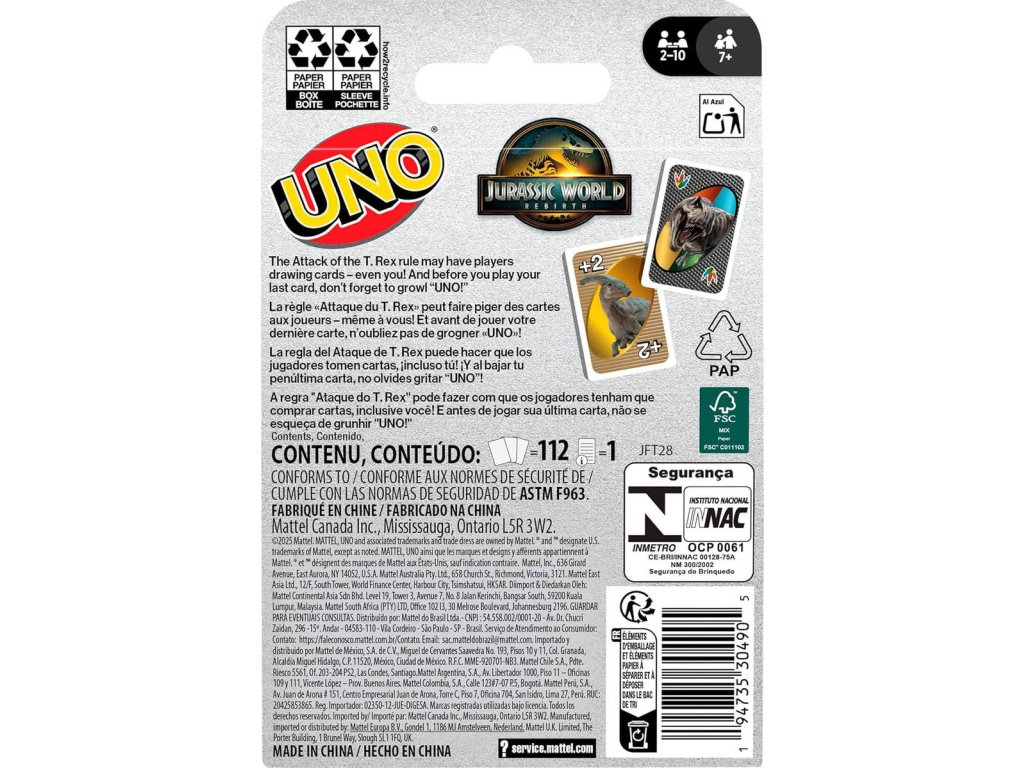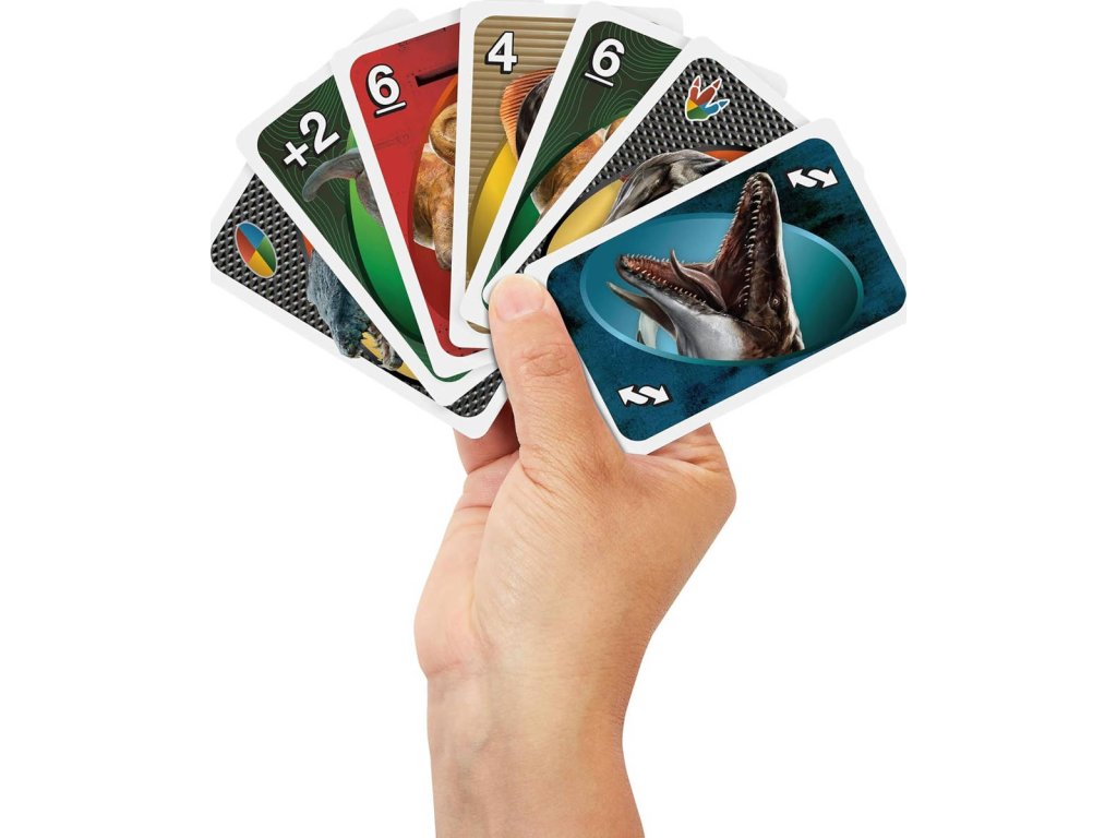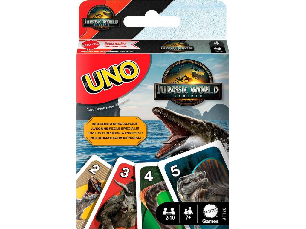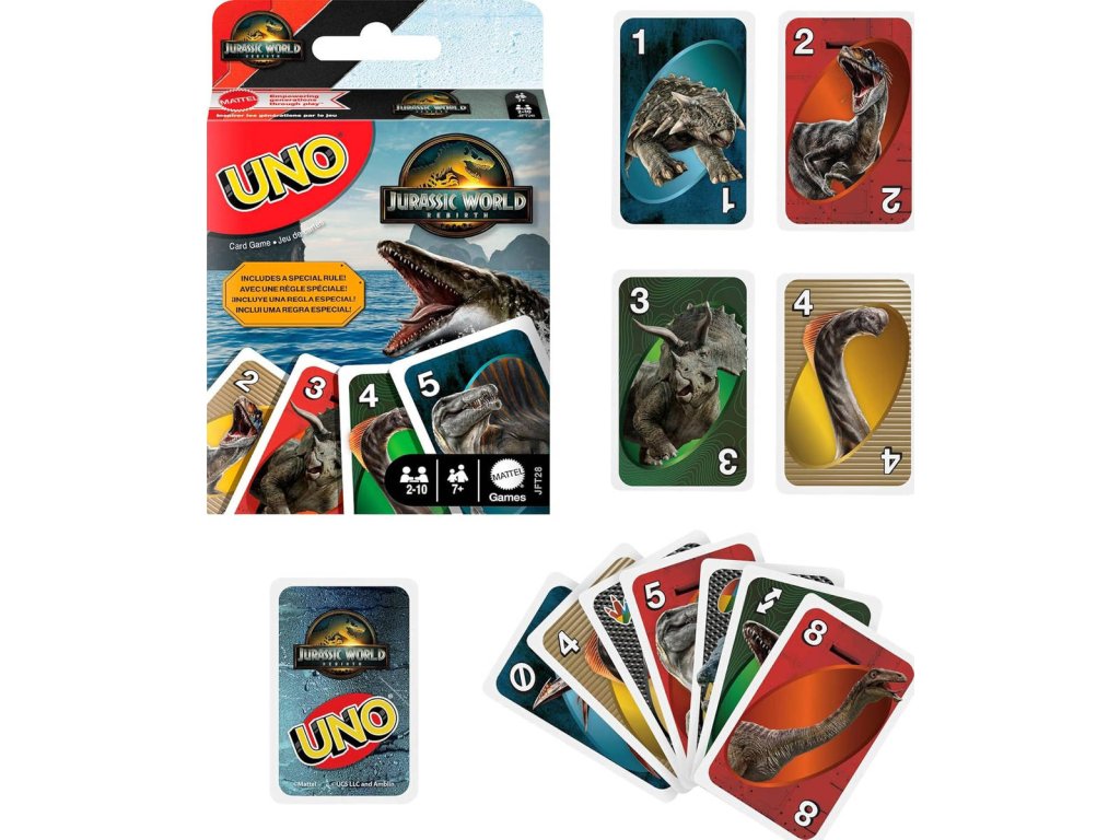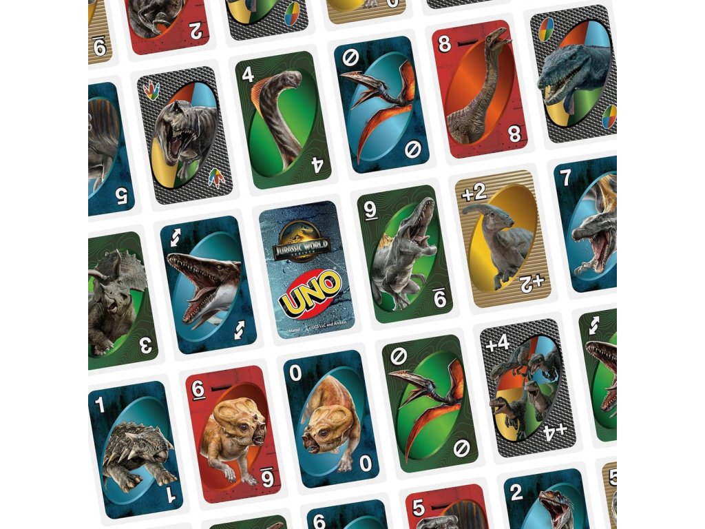 Fanoušci Jurského světa: Znovuzrození si zamilují hraní této tematické karetní hry UNO. Balíček obsahuje grafiku inspirovanou oblíbenými postavami a scénami z filmu a hráči se snaží spojovat barvy a čísla – navíc je zde speciální pravidlo „Útok T. Rexe“, při kterém musí někdo líznout pět karet! A když vám zbývá poslední karta, nezapomeňte zavrčet „UNO!“ Skvělý dárek pro milovníky Jurského světa: Znovuzrození a karetních her