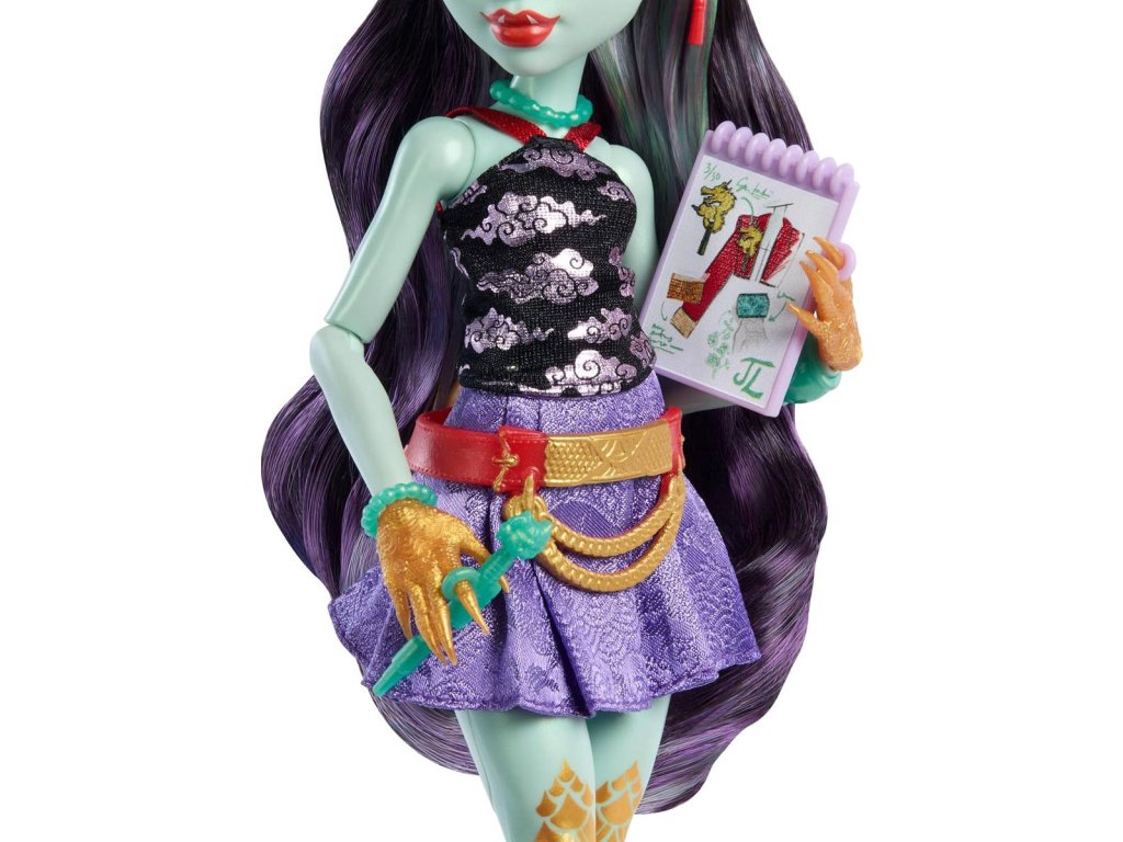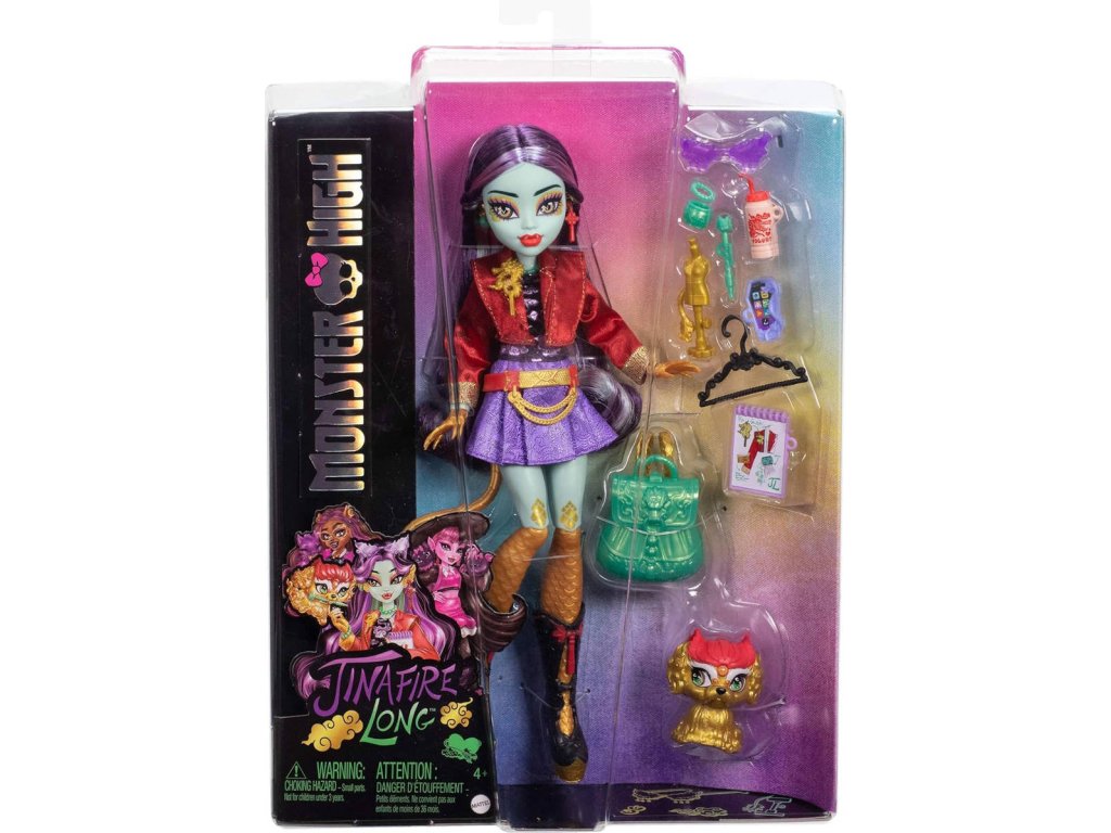 Základní panenka Jinafire Long je okouzlující, stylová a temperamentní dračice, která ovládá počasí. Do Straškoly přijela v rámci zahraniční výměny ze školy ve Fanghai. Jinafire miluje módu! Její výrazný top na zavazování za krkem a sukně s potiskem obláčků skvěle ladí s krátkou bundičkou. Stylový outfit doplňují módní doplňky. Zvířecím společníkem Jinafire je Yun Yun – věrný přítel, který v sobě spojuje pekingského psíka a čínského lva! Díky pohyblivým kloubům v trupu, loktech, zápěstích a kolenou můžeš panenku Monster High nastavit do dynamických póz připravených k děsuplné akci.