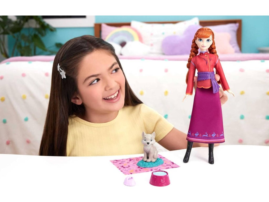 Tento set s módní panenkou Annou, inspirovaný Disney Ledovým královstvím a krátkými videi „Zvířátka z Arendelle: Ztraceni a nalezeni", představuje oblíbenou hrdinku, jak se stará o vlčí mládě! Pohyblivá panenka Anna má svůj typický účes s dvojitým copem a obléká odnímatelné šaty, pásek a vysoké boty. Součástí je také miska se zábavnou otočnou funkcí, díky které mohou děti zvířátku nabídnout jídlo nebo vodu. Fanoušci si mohou pořídit i další panenky a herní sety inspirované Disney Ledovým královstvím a sérií „Zvířátka z Arendelle: Ztraceni a nalezeni" - například Elsu s medvídětem! (Každý produkt se prodává samostatně, dle dostupnosti.)
