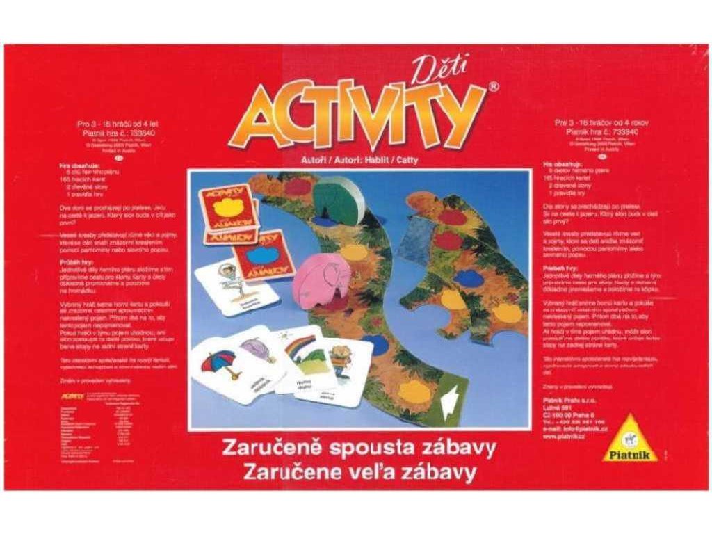 Verze oblíbené hry Activity Original přizpůsobená dětem. Pojmy na kartičkách jsou kreslené s jasným popiskem. Postavte dva teamy a nechte si děti touto hrou rozvíjet fantazii, vyjadřovací schopnosti a slovní zásobu.Zábavná hra Activity Děti pro nejmenší! Interaktivní společenská dětská hra rozvíjející fantazii, vyjadřovací schopnosti a slovní zásobu. Tato kombinace tvořivosti a výrazových možností byla testována s velkým úspěchem mateřskými školami. Otázky jsou rozděleny do několika kategorií, které přistupují k dětem individuálně. Délka hry se může podle potřeby upravit. Activity podporují schopnost vyjadřování u našich nejmenších.