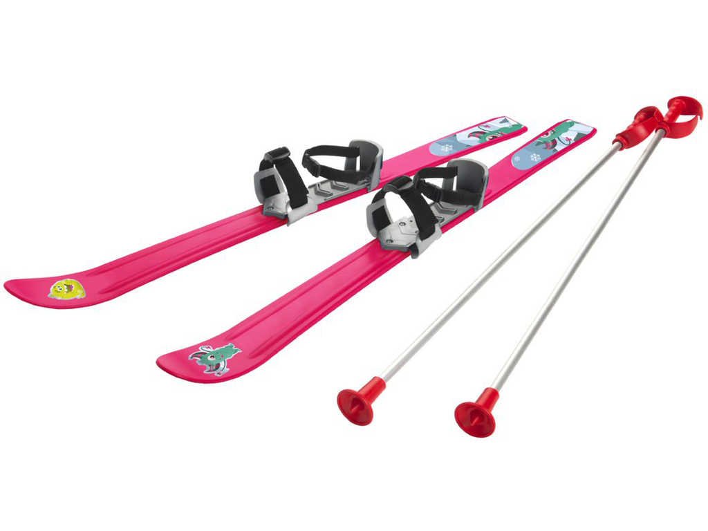 Dětské plastové sjezdové lyže s vázáním a hůlkami, v carvingovém provedení, v růžovofialové barvě. Vázání je přiděláno napevno. Navrženo speciálně pro nejmenší lyžaře! Výrazné bezpečnostní prvky.Bezpečnostní úprava lyžařských holí - aby byla minimalizována možnost bodných zranění u nejmenších lyžařů, jsou hole lyží BABY SKI zakončeny plastovým trychtýřem (namísto obvyklého bodce). Plastová