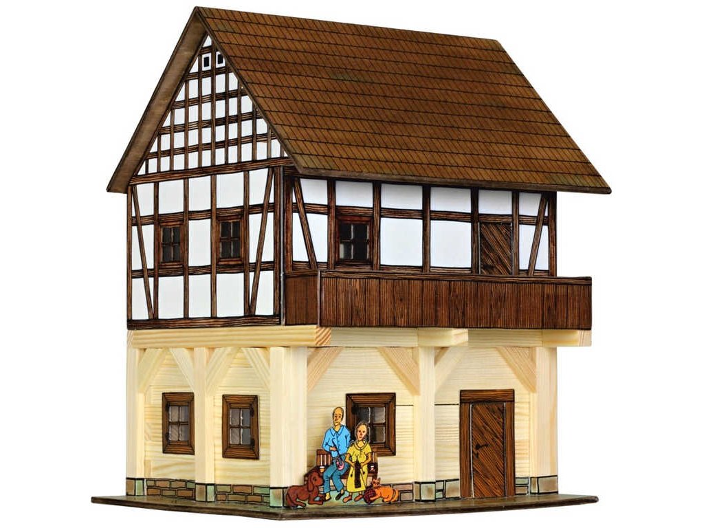 Walachia 33W37 Hobby Kit - Hrázděný špýchar.Dřevěná slepovací stavebnice obsahuje dřevěné hranolky daných délek ke stavbě roubených stěn, díly na střechy a štíty, kartonové výseky oken a dveří i předtištěné papírové potisky. Součástí stavebnice je