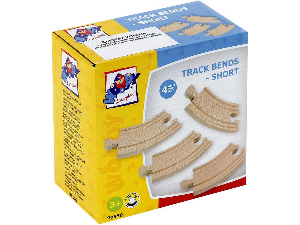 Příslušenství k dráze - Čtyři kusy kolejí do oblouku (zatáčka).Dřevěné hračky jsou oblíbené nejen dětmi, ale i rodiči. Hračky ze dřeva patří mezi zdravotně nezávadné hračky.