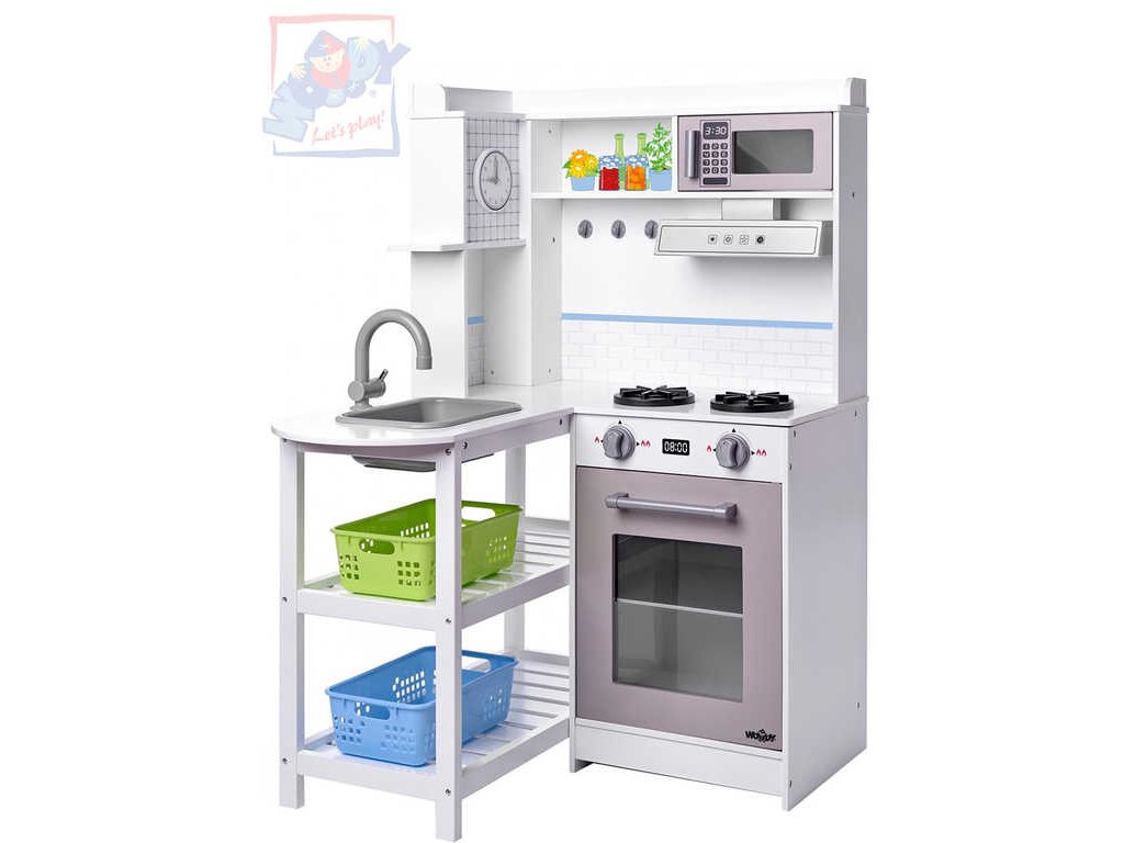 Kuchyňská linka se zvukovými a světelnými efekty. Po zatížení hrncem se plotýnka podsvítí červeným světlem a ozve se zvuk bublající vody. Po zmáčknutí tlačítka na digestoři se na jeho spodní straněrozsvítí světlo. Svým jednoduchým designem a bílou barvou se kuchyňka hodí do každého dětského pokojíku. Hračka se světlem a zvukem na baterie.