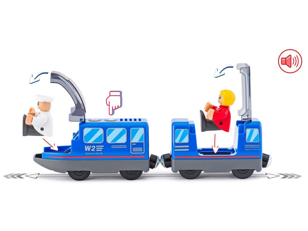 Woody modrý plastový vláček. Součástí mašinka, vagónek a 2 kloubové figurky. Hračka na baterie, se zvukem.Plastová mašinka vhodná do dřevěných vláčkodráh s funkcí vpřed / vzadu / zvuk. Obsahuje 2 figurky s polohovacími končetinami. Figurku řidiče umístíme na své místo vyklopením předního průhledného skla.